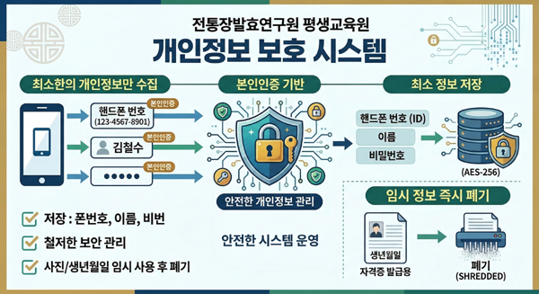 우리 교육원은 수강생 여러분의 소중한 개인정보를 안전하게 보호하기 위해 ‘개인정보 최소 수집 및 즉시 파기’ 원칙을 철저히 준수하고 있습니다. 정식 개원을 앞두고 현재 진행 중인 운영 방침을 안내드리오니 이용에 참고해 주시기 바랍니다.